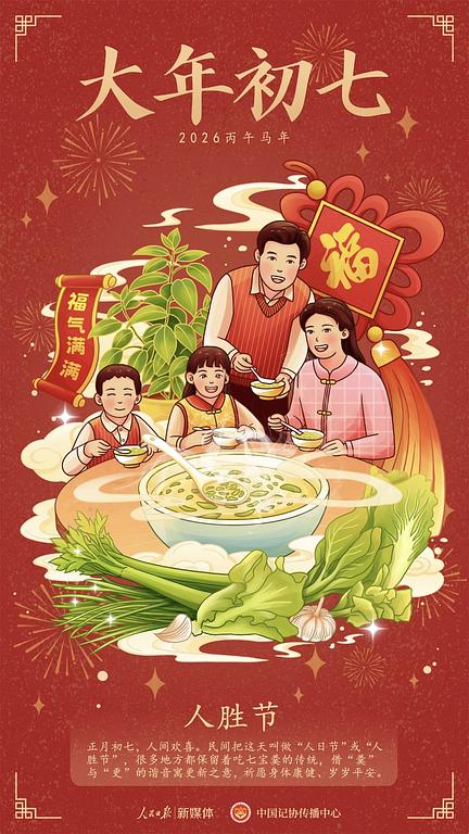 今天是大年初七传说是人类的诞辰民间把这天叫做“人日节”或“人胜节”一些地方的人们要吃七宝羹 借“羹”与“更”的谐音寓更新之意从今天起迎接一个崭新的自己保持信心、勤耕不辍坚定地向着目标走下去生活终会有灿烂的模样