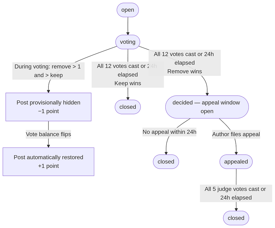 Topic creators manually trigger a review. 12 jurors vote within 24 hours — if remove votes win, the post is hidden. Authors can appeal; 5 judges then conduct a final review. Correct votes earn point rewards.
