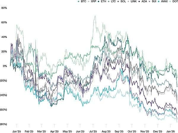 我很少在网上或主流媒体上看到有人讨论这件事,但这却是千真万确的事实。比特币比2025年10月的历史高点下跌了39%,以太坊下跌了53%,许多其他加密资产的跌幅更大。
