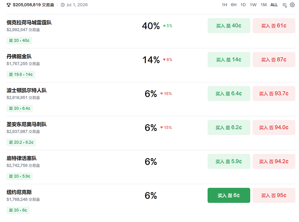 这是2026年NBA总冠军的预测,我买取前6名的胜率,让他最终赢得胜利获得都是20美元,那么我们一个花费了15.6美元,只要不是黑天鹅事件我们就是赚钱的。