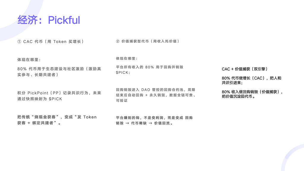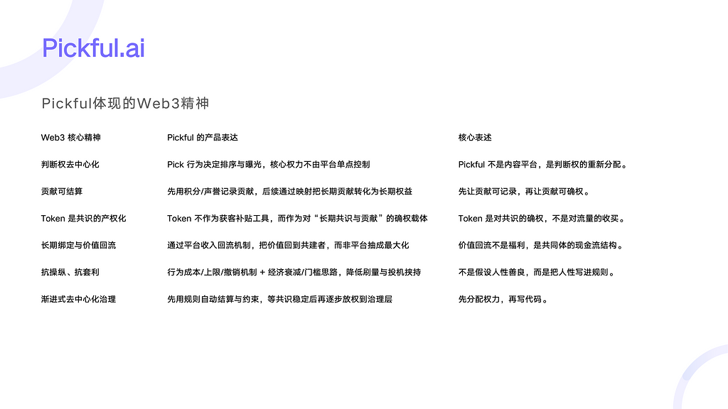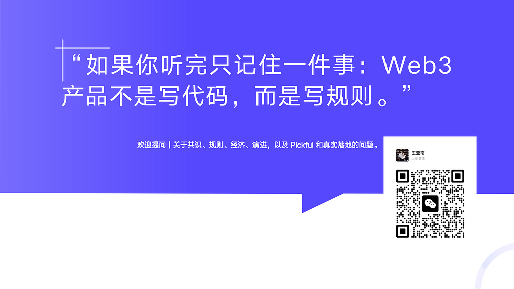 Web3 产品不是功能或 App,而是一套规则系统。核心问题是:一群互不认识的人,如何在同一套规则下协作、分账、分权,并在分歧中持续演进。通过比特币、以太坊等案例,提炼出 共识、规则、经济、演进能力 四个关键要素,并将其落到 Pickful 的产品设计与治理实践中。