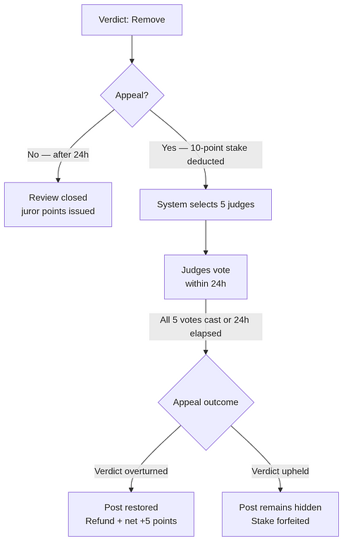 • The system settles the current vote: if the result is Remove, the appeal proceeds; if Keep, the post is restored and no appeal is needed