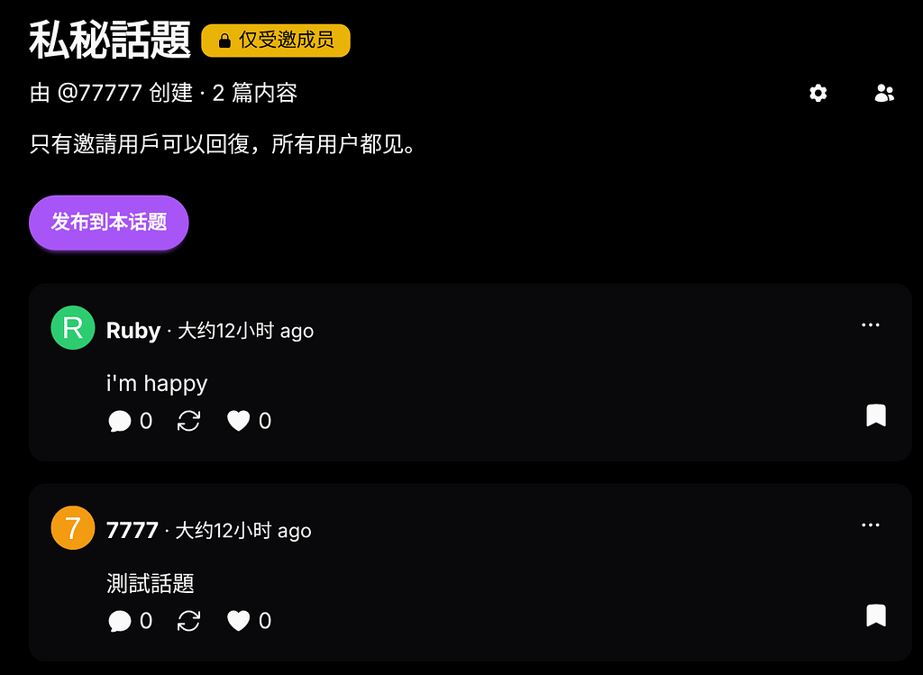 私密话题上线! 现在你可以创建私密话题,只有被邀请的成员才能发帖。支持成员邀请、角色管理,打造专属的小圈子讨论空间。