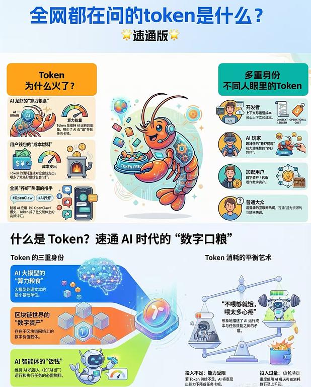 全网都在问的token是什么?来速通 [暗中观察R]Token的多重身份 - 对开发者,它是上下文和成本 - 对 AI 玩家,它是“养虾饲料” - 对加密用户,它是数字资产 - 对普通人,它则成了一个最容易被混淆的互联网热词 🔥 最近如果碰到大家在问“Token“,那完全是因为全民“养虾”🦞而带出来的“AI虾饲料”的梗,也就是喂养openclaw的AI的算力粮食,即调用API的计算单位 🤖️ AI世界的Token:AI 的算力粮食,也是钱包燃料,是真金白银的花费 - 在AI大模型里:Token是文字的最小处理单位 - 英文:1单词 ≈ 0.75-1.3 Token - 中文:1.3-2汉字 ≈ 1 Token 你每次对话、让它写代码、做总结,都在消耗Token(输入+输出都算),而且API是按Token计费的!大约每百万Token几美元到几十美元不等 重度用户一天可能花掉上千元😱 ⛓️ 区块链世界的 Token:区块链上的数字资产 可以想象成:数字世界的“股票/会员卡/积分”;可以交易、转移、持有。