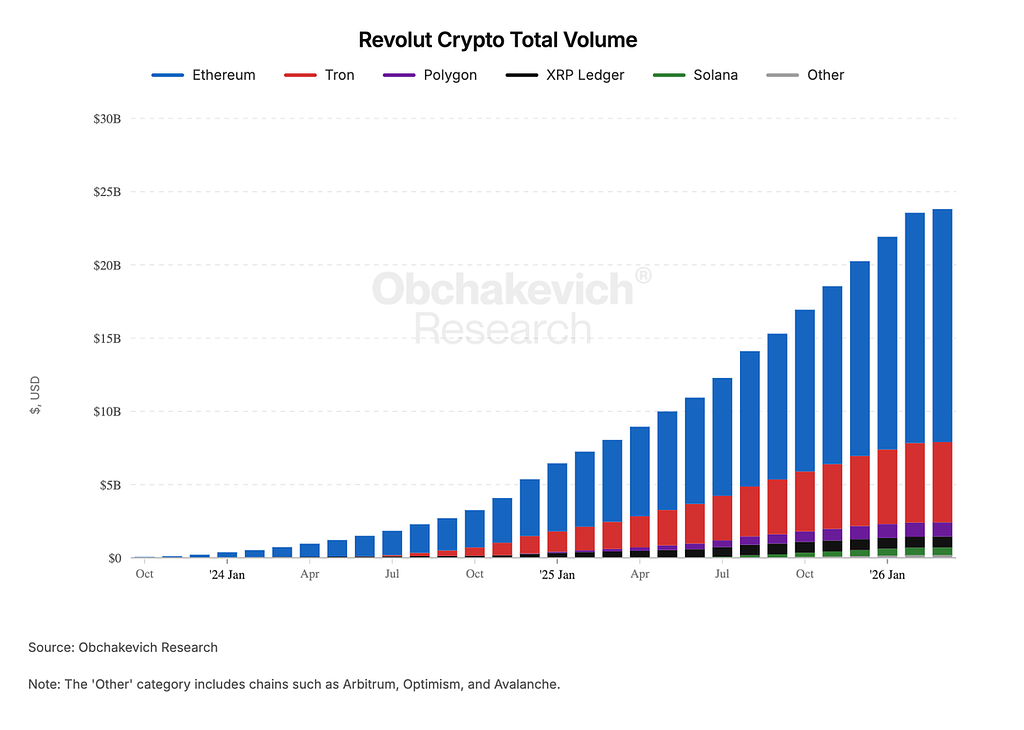 #Revolut 积极为用户提供加密货币及稳定币服务,尤其通过RevolutX平台。其中以太坊 @ethereum 交易最为活跃,占总交易量的67%。 @trondao 以约23%占比位居第二,随后是 @0xPolygon 、XRP账本( @Ripple )及 @solana 。