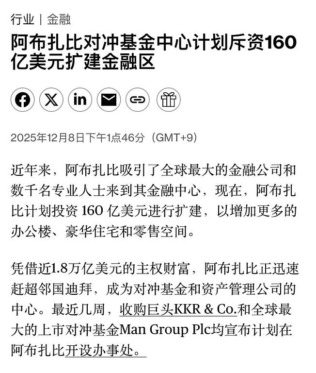 今天彭博社首页,阿布扎比正计划投入 160 亿美元 ,扩建金融核心区,新增更多办公楼、豪宅和商业空间。
