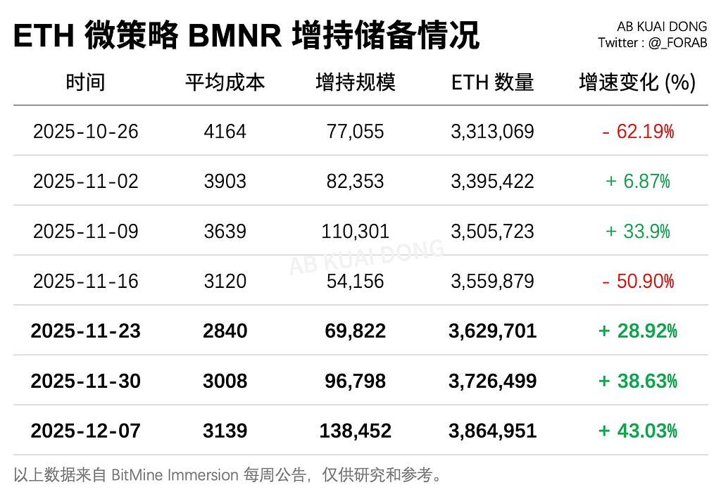 上周 BMNR 买入了 13.8 万枚 ETH,创自 10 月中旬以来,最高的单周增持记录。
