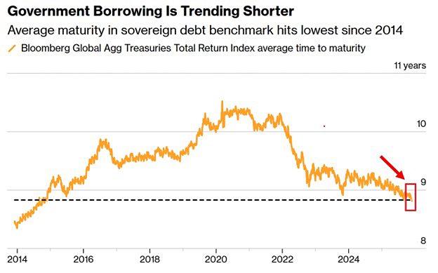 全球各国政府正积极转向短期借贷:全球政府债券的平均到期期限已降至8.8年,为2014年以来的最低水平。自2021年以来,平均到期期限已缩短1.5年,因为各国越来越依赖国债来弥补不断扩大的赤字。这一转变尤其受到英国、日本和美国的影响,随着需求减弱,这些国家减少了长期债券的发行。政府借贷已经失控。