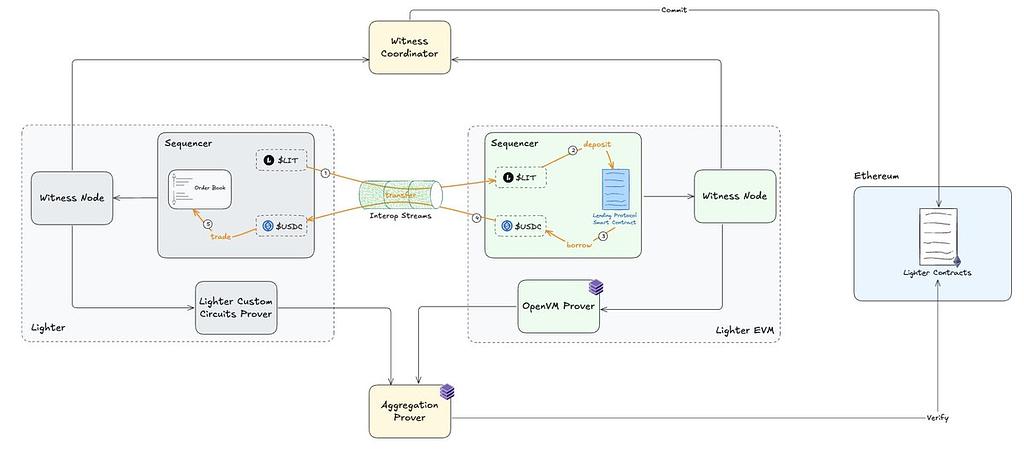 通过在以太坊主网上与 Lighter 联合结算,Lighter EVM 能够与 Lighter 市场实现快速互操作性。用户将能够通过 Lighter EVM 转移资产、下单和管理 Lighter 头寸。关键的是,通过证明聚合,Lighter EVM 和 Lighter 执行将在以太坊上一起得到验证,允许用户在执行环境之间以秒为单位移动,而无需等待 #L1 最终性。在启动时,Lighter EVM 将支持 Lighter 状态的同步读取,以及像质押、下单和资产转移这样的操作的快速异步写入。我们正在积极研究减少写入延迟的方法,并可能提供同步选项。