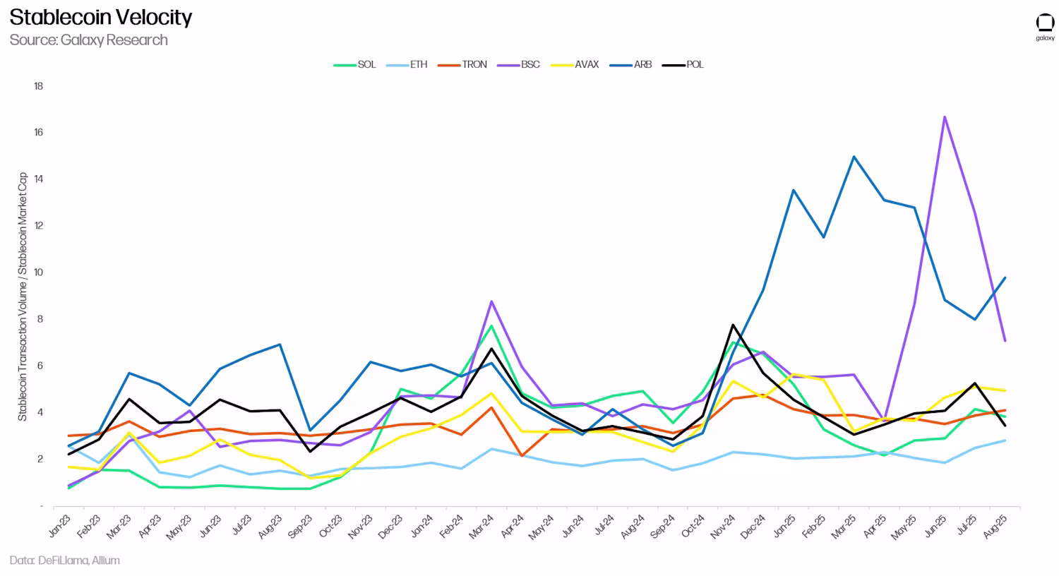 稳定币流通速度数据也印证了这一观点。尽管以太坊拥有最大的稳定币基数,但其流通速度却很低,这反映出其资金主要被存放在 DeFi 协议中或用作抵押品。相比之下,Solana 的周转率始终高于以太坊,每个稳定币美元每月都会被交易多次。这种持续的流通速度有助于解释为什么 Solana 的绝对 TVL 低于以太坊,却依然能够产生巨大的 DEX 交易量、手续费收入和应用活跃度。实际上,Solana 的稳定币运转得更加高效,在交易、支付和应用领域快速流通,这种动态与其作为一条针对吞吐量和活跃度进行优化的区块链的整体定位相符。