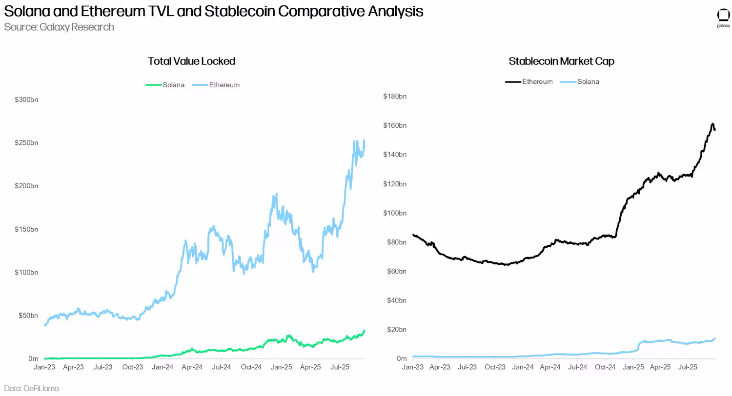 交易量和手续费反映了 Solana 的活跃程度,但另一个重要的指标是生态系统中锚定的资金量。总锁定价值(TVL)和稳定币市值最能体现这一点。TVL 衡量用户承诺用于借贷、提供流动性和质押的资产,是长期持有资金信心的信号。同时,稳定币市值则提供了注入生态系统的净新增流动性的另一个指标。2022 年 11 月 FTX 崩盘后,Solana 的 TVL 和稳定币市值遭受重创。SOL 价格暴跌,加上人们对该链信心的丧失,导致 TVL 从峰值的 140 多亿美元骤降至谷底的不足 5 亿美元。然而,从 2024 年开始,情况稳步好转,这两个指标在 2025 年均创下历史新高。尽管如此,Solana 在这两项指标上仍然落后于目前占主导地位的加密 DeFi 生态系统以太坊。正如 Galaxy 研究员 Zack Pokorny 在其 2025 年第二季度加密货币杠杆状况报告 中强调的那样,以太坊占据了所有 DeFi 借贷供应量的 78%,而 Solana 的份额仅为 5.43%。