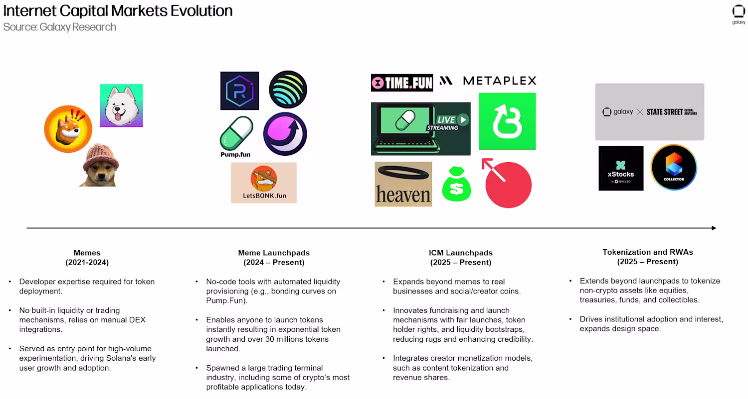 • 模因币周期催生了 Pump.Fun 等代币发行平台,这些平台规范了链上发行和散户参与。MetaDAO、Metaplex 和 Believe 等第二代平台则将代币发行从投机扩展到创作者和企业融资领域。