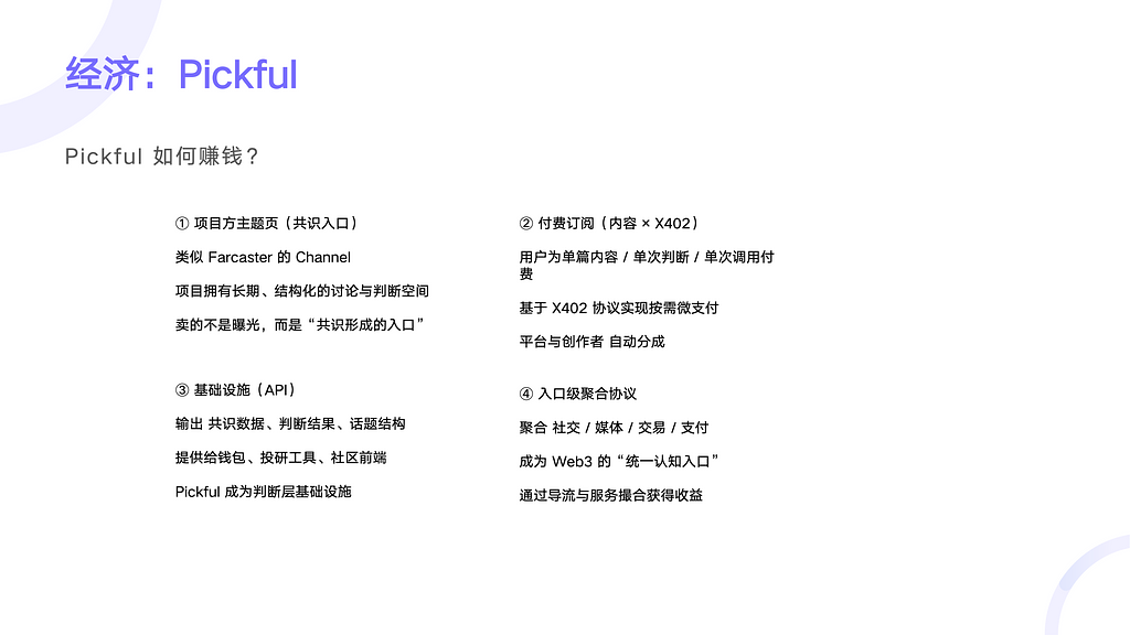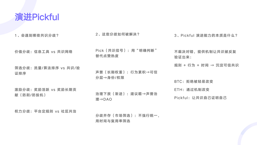 Web3 产品不是功能或 App,而是一套规则系统。核心问题是:一群互不认识的人,如何在同一套规则下协作、分账、分权,并在分歧中持续演进。通过比特币、以太坊等案例,提炼出 共识、规则、经济、演进能力 四个关键要素,并将其落到 Pickful 的产品设计与治理实践中。
