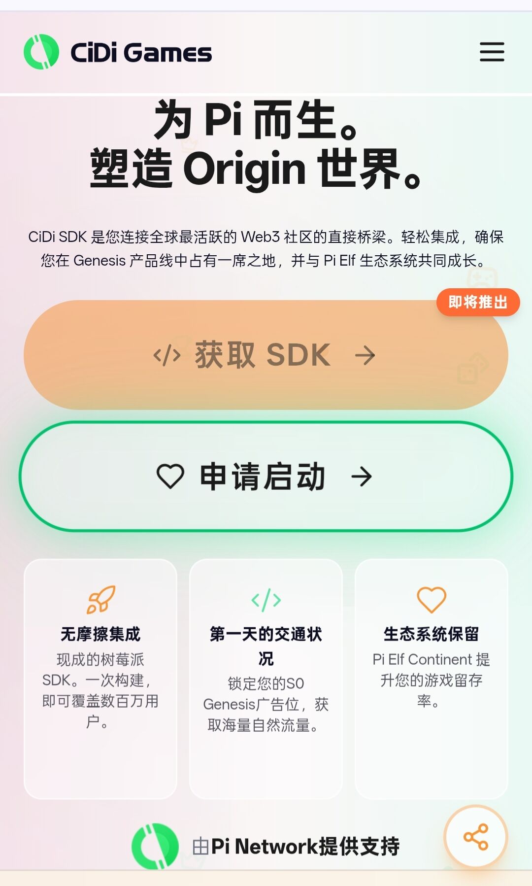 · “由 Pi Network 提供支持”:这层关系意味着,对开发者来说,接入 CiDi 就等于直接面对 Pi 的6000万活跃用户;对 Pi 用户来说,这是他们用 Pi 币参与游戏、消耗资产的最便捷场景。