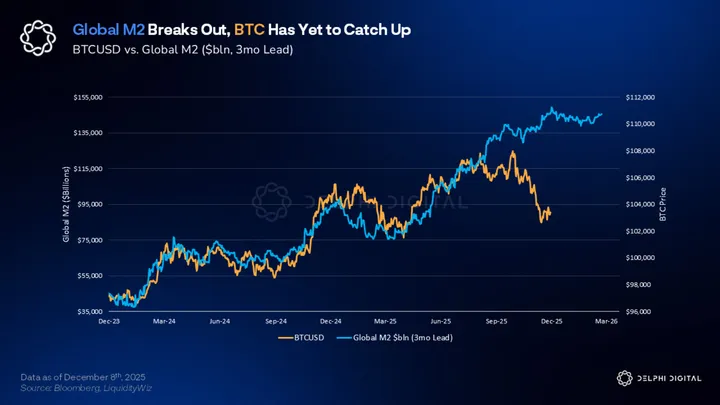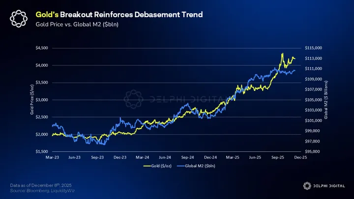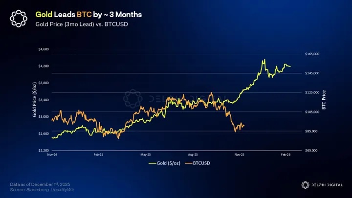 如果 #黄金 和全球 M2 通常领先比特币约 3-4 个月……