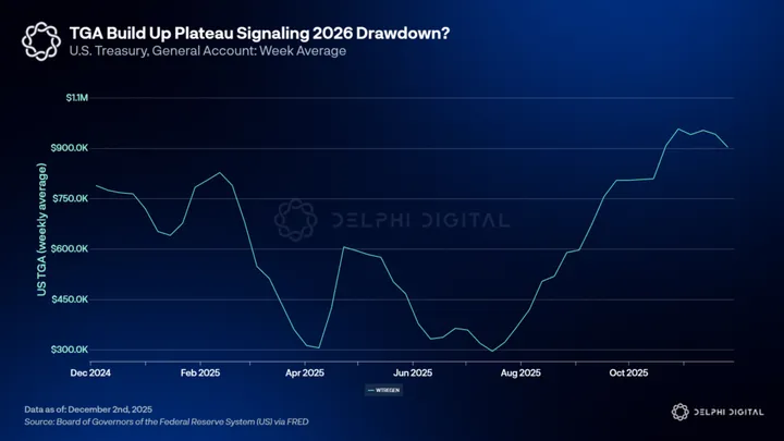 财政部一般账户(TGA)图表实时显示了 2025 年政治和财政动荡的影响。财政部曾预计 TGA 资金补充目标接近 8500 亿美元,但余额已飙升至近 1 万亿美元(这主要是由于预防性债券发行、政府停摆和行政时间安排等因素共同作用的结果)。