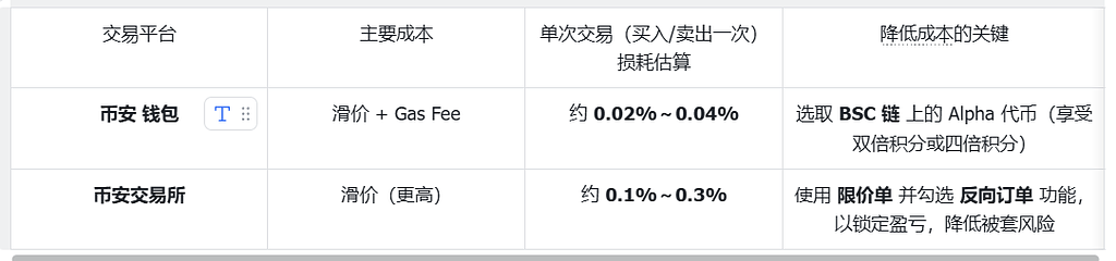 币安 Alpha 积分主要通过“买入-卖出”循环来获取交易量积分,因此成本主要由两部分构成: