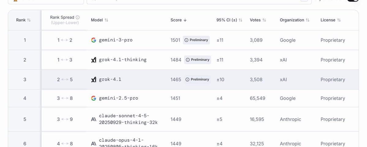 谷歌的 Gemini 3 和 xAI 的 Grok 4.1 开始展现其相对于所有竞争对手的巨大基础设施优势。关键不在于 GPU 或 TPU 的数量,而在于集群/架构中*一致*的 GPU 数量以及跨集群/架构的通信成本。Gemini 3 和 Grok 4.1 显然是目前最好的模型,OpenAI 尽管推出了 5.1 版本,但仍未能与之匹敌。这是 OpenAI 首次位列第三。