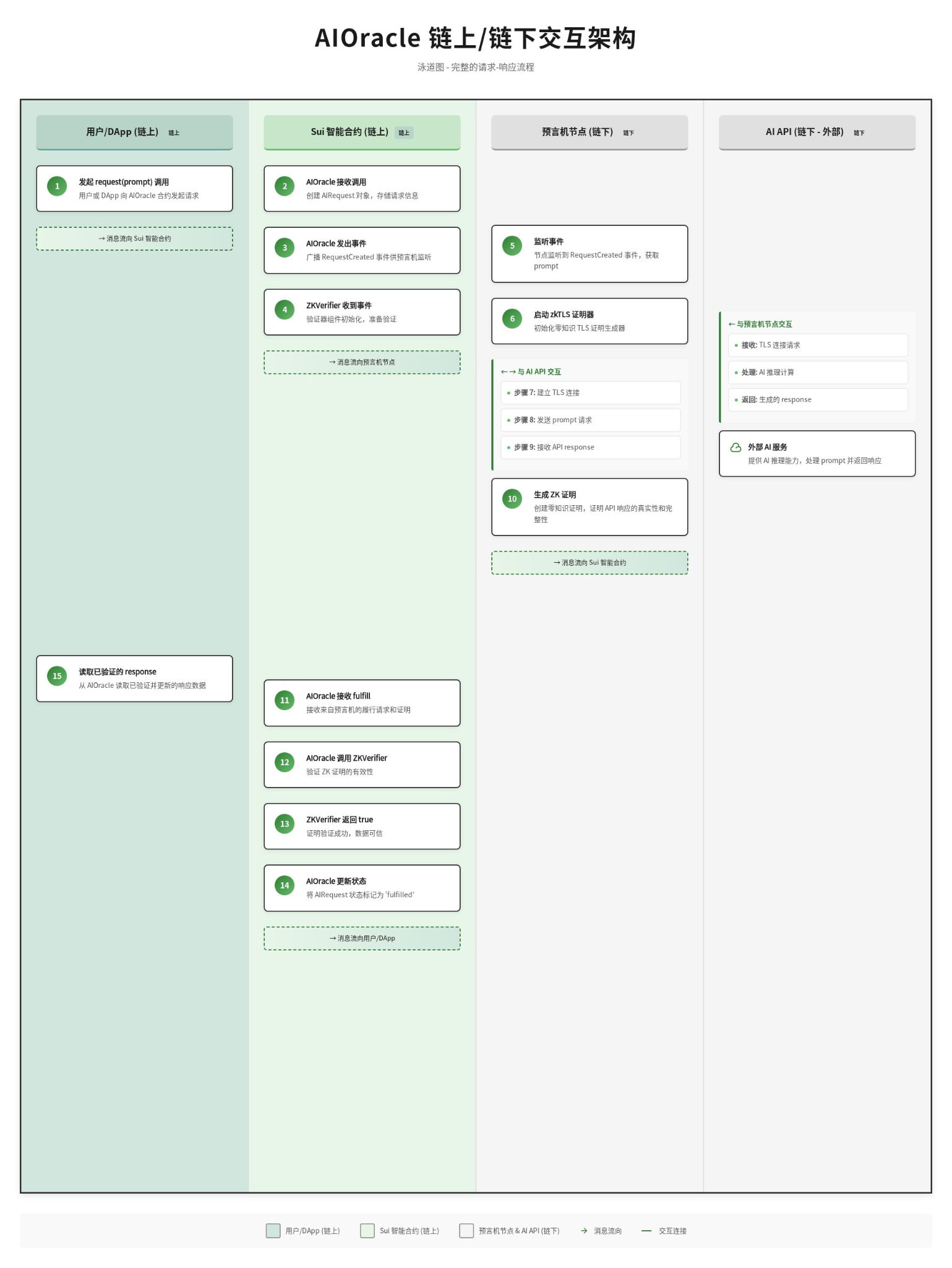 下图展示了 AI Agent、Sui 智能合约、链下节点和外部 AI API 之间完整的交互架构: