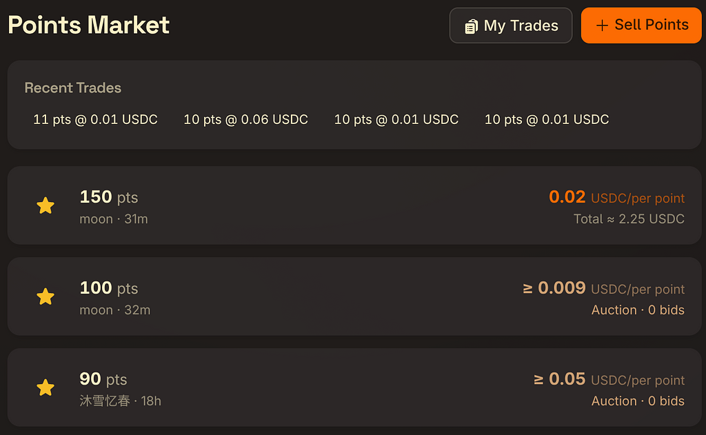 • 任何用户都可以挂单出售积分,设定价格(USDC)